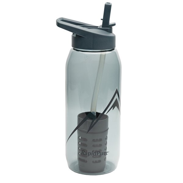 RapidPure® Purifier & BottlePerfect for weekend hikes, global adventures, or everyday use, the RapidPure® Purifier + Bottle gives you the power to filter and purify water as you drink with no pressing, squeezing, priming, or back-flushing required.Adventure Medical simplified water purification with the POD system and UltraCeram® purification technology. The POD purification system has an extended lifespan – up to 75 gallons – and continues to work after being frozen for peace of mind if the temperatures suddenly drop. Unlike microfilters that rely on small pore sizes to filter out bacteria and sediment, RapidPure® purifiers combine OpenPore technology for fast flow rates with adsorption (natural magnetic attraction) to remove viruses, bacteria, parasites, sediment, and more.Simply fill and drink from the 32oz proprietary Triton bottle for purified water without any special handling needed.Features:Easy to Use - Simply fill and drink for purified water – no waiting, pressing, squeezing, priming, or back-flushing requiredVirus Protection - Treats water for viruses, bacteria, parasites, and more with UltraCeram® technologyFaster Flow Rates - OpenPore technology uses adsorption (natural magnetic attraction) combined with larger pore sizes for easy drinkingUse Anywhere - A purifier can be used after being frozen. The POD system has extended cartridge lifespan to 75 gallonsModern Bottle Design - The proprietary Triton bottle with a modern lid and bold graphics for a fresh lookGreat Tasting Water - Activated carbons instantly remove odors and improve tasteIn the Box:32oz Triton water bottle with straw/lidRapidPure® POD CartridgeInstruction manual*Sold as an Individual