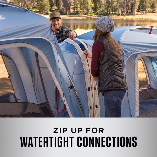 3-Person & 6-Person Connectable Tent Bundle with Fast Pitch Setup - Set of 2 - BluePart of a customizable connecting tent system, the 6-Person Connectable Tent can be used as a standalone or zipped to other compatible tents at 3 fully enclosed connection points in any configuration (additional 6-Person and 3-Person Connectable Tents sold separately). This Fast Pitch tent sets up in no time thanks to pre-attached poles and hub, fast-fit feet, and snag-free Insta-Clips that secure poles in a snap. If it rains, the WeatherTec system keeps campers and gear dry with welded floors and inverted seams that prevent water from seeping in. For additional weather protection, the strong cabin-shaped frame is factory tested to withstand winds of 35+ mph, and an extended door awning and rainfly keep out precipitation. When it's time to pack up, the tent easily fits into an included carry bag for no-hassle transport and storage until the next adventure.Features:PART OF CONNECTING TENT SYSTEM: Zip compatible tents together to keep growing families, groups of friends, and excess gear connected on campgroundsFULLY ENCLOSED CONNECTION POINT: Offers ample height for ease of movement and privacy doors between connected tentsQUICK AND EASY SETUP: Fast Pitch system shortens setup time with pre-attached poles and hub, fast-fit feet, and snag-free Insta-Clips to secure tent to poles in a snapCAMPERS AND GEAR STAY DRY: WeatherTec system's welded floors and inverted seams help keep water out; a strong frame is factory tested to withstand winds of 35+ mphEASY ACCESS TO ELECTRICAL POWER: Bring extension cord inside tent through a convenient E-PortGREATER VISIBILITY AND VENTILATION: Reflective guy lines included for stability and more visibility at night; enlarged windows and roof vents allow for enhanced ventilation and viewsAMPLE ROOM TO STRETCH: 8' x 6' interior easily fits 1 queen-size airbed; 4.8' center height
