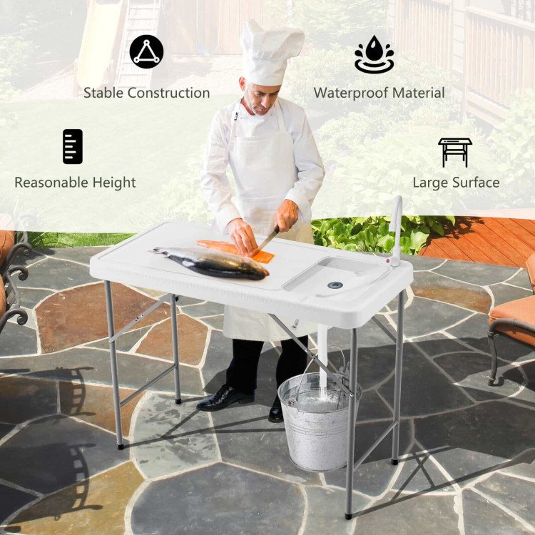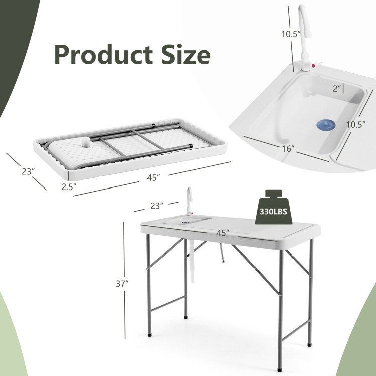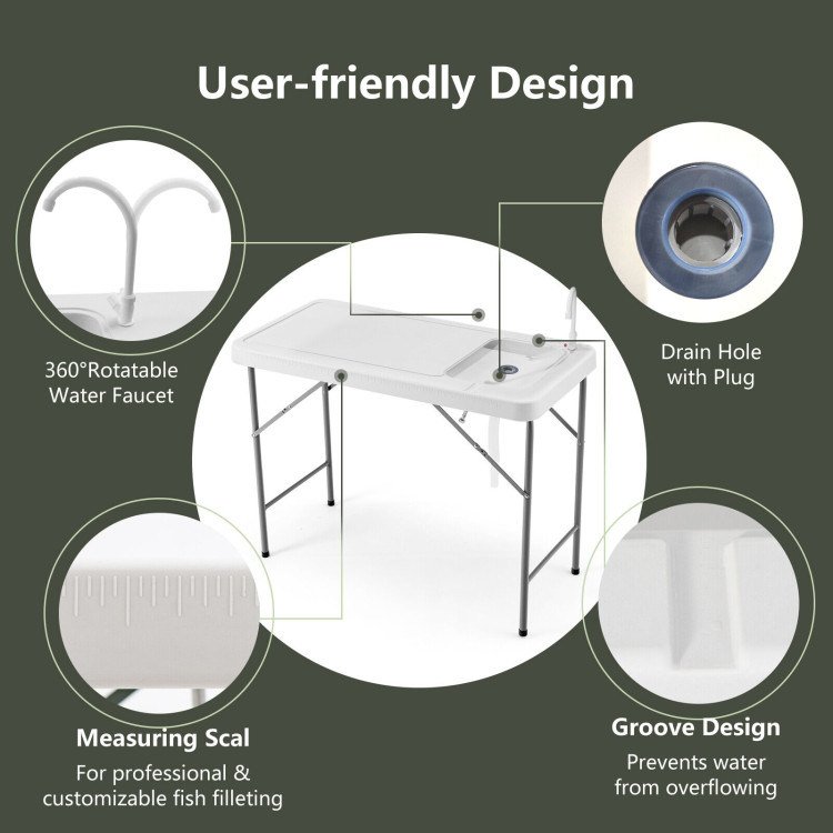 Foldable and lightweight design for easy movement and storageSturdy steel frame with the anti-rust surface for strong weight capacityPremium and waterproof HDPE material for easy maintenance and great durabilityH-shaped frame and triangular structure adds extra stabilityIntegrate sink with drain plug for easy cleaningConvenient to drain water through the drainage hose360°rotatable faucet allows you to wash food at any angleContainment groove design prevents water from overflowThe scale is designed to measure fish fillet sizeSuitable for picnic; camping; fishing; hunting; etc