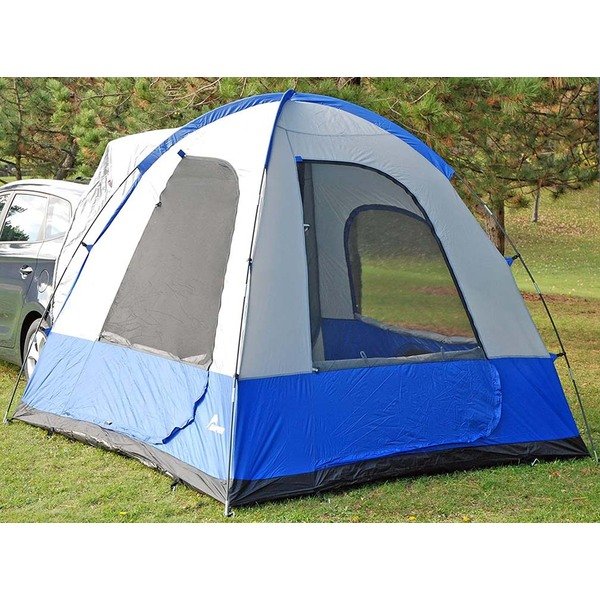 Napier Sportz Dome-To-Go Tent The Sportz Dome-To-Go is the only hatchback tent on the market designed to fit compact vehicles! With an adjustable vehicle sleeve, you can easily connect your tent to the cargo area of your vehicle, creating additional sleeping or storage space for your adventure gear! Move around easily with over 6.5 feet of headroom and keep organized with the internal gear lofts and pockets. Looking to head out for the day on a cool adventure? No problem! The Dome-To-Go easily transforms into a standard ground tent. This convenient travel accessory is always ready for a spontaneous trip, so what are you waiting for? Get out there and experience the great outdoors! Capacity: 4 Dimensions: 8.5' x 8.5' Center Height: 6.7' Weight: 30 lbs Color: Blue & Grey No. of Doors: 2 No. of Windows: 3 Tent Poles: 2 Shock Corded Fiberglass Awning: 2 Shock Corded Steel Storm Flaps: Windows & Doors Water Proofing: 1200mm PU Coating Wall & Roof Material: Polyester Taffeta Windows Material: Polyester Mesh Floor Material: Polyethylene Rainfly Material: Polyester Taffeta with Taped Seams Rear Access Panel Awning 3 Seasons- Spring, Summer, Fall Storage: Gear Loft, Gear Pocket, Lantern Holder & Expandable Carrying Bag