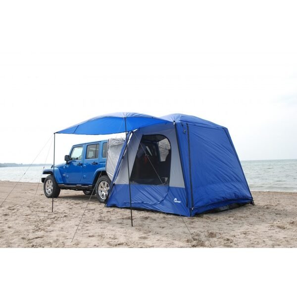 Sportz SUV Tent 9' L x 9' W x 7.25' H Two Large Doors & Two Large Mesh Windows Sleeps up to 5 People (Plus 2 in SUV Cargo Area) Water-Resistant Polyester/Taffeta Blend & Polyethylene Floor Steel and Fiberglass Pole Structure for Simple 1-Person Setup Full-Length Tape-Seamed Rain Fly with 6' x 6' Awning for Shade GoBe Dry Protection System Fights Wet Conditions Lantern Holder & Gear Loft Hang from Ceiling Two Interior Pockets Organize Smaller Items Storm Flaps in Windows Add Privacy Skylight Provides Ventilation