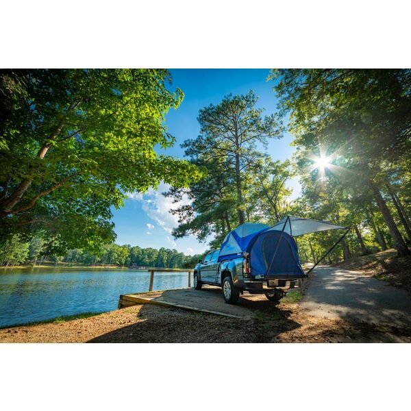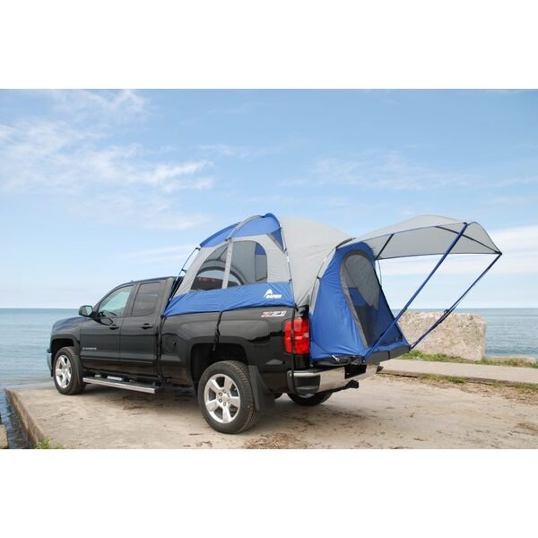 Fits Full-Size Truck with 96"e; to 98"e; Bed Quickly convert your pickup's bed into a dry and comfortable home away from home with the Napier Sportz Truck Tent 57 Series Designed to fit virtually any pickup truck on the market today Patented fully enclosed floor; keeping you clean and dry from the elements Full rainfly provides full weather protection The tents large interior area boasts over 5.7"e; of headroom Poles are constructed of fiberglass and steel to prevent breaks and splintering, shock-corded to prevent loss and color-coded for quick setup Three large mesh windows and two side vents prevent condensation while providing fresh air and dramatic panoramas Includes a seam-sealed 4' x 4' awning extends off the tailgate and a convenient carrying bag Well organized with an internal gear loft, gear pocket, and a built-in lantern holder A rear access panel to your truck's cab window (access cab opening) allows cords to run between your truck's cab and the tent to accommodate cell phones, GPS and any device that requires charging