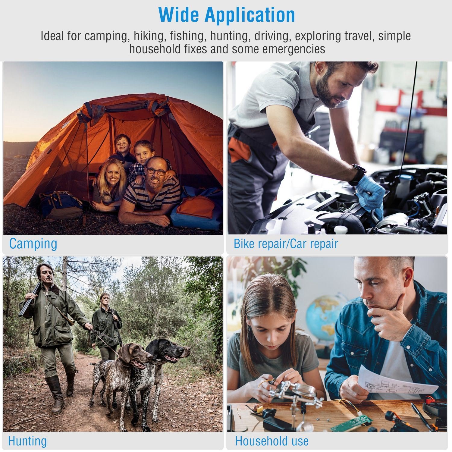 **WIDE APPLICATION*:Ideal for camping; hiking; fishing; hunting; driving; exploring travel; simple household fixes and some emergencies.