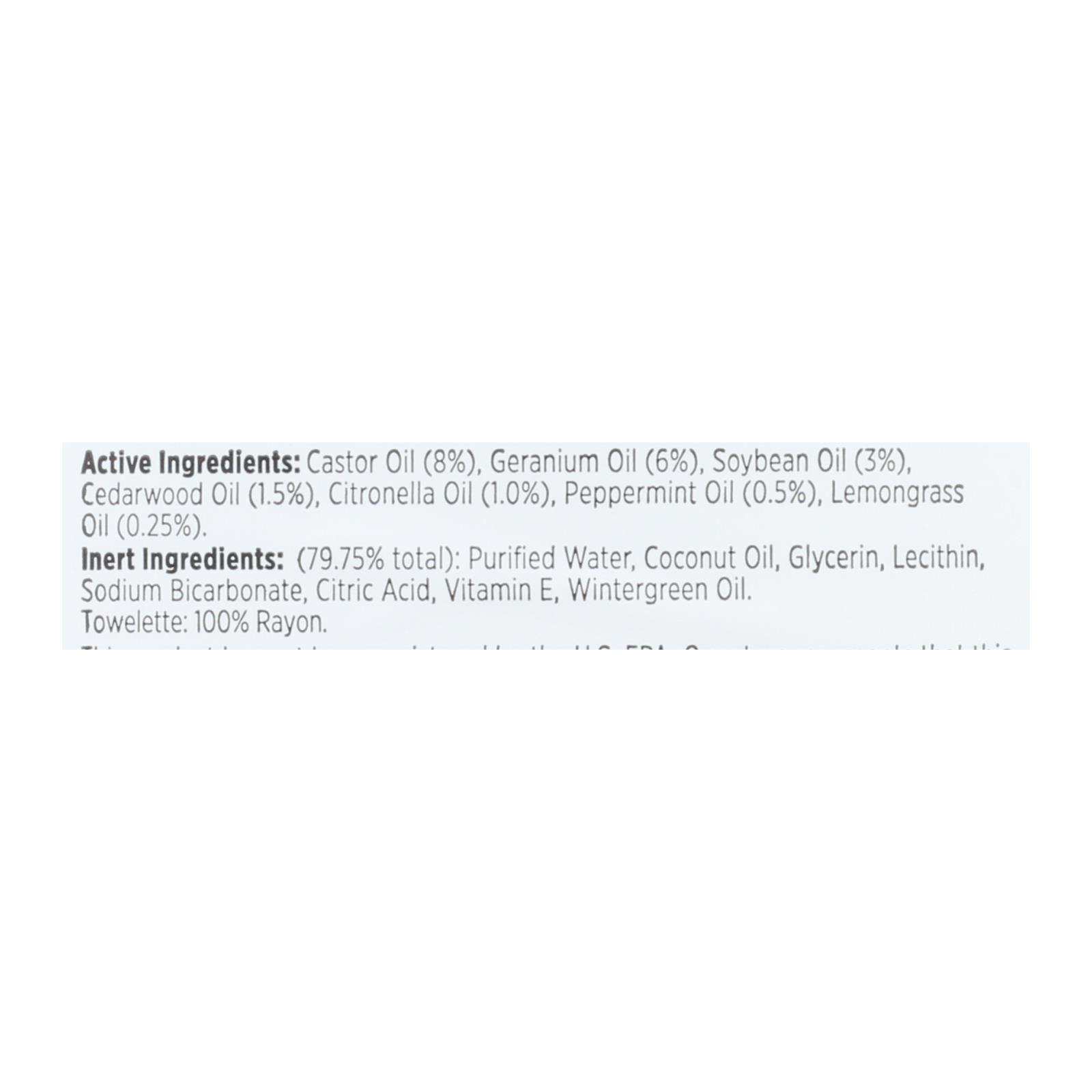 BUZZ AWAY EXTREME TOWELETTES NATURAL INSECT REPELLENT ARE CONVENIENT WIPES WITH A LONG-LASTING AND POTENT FORMULA TO REPEL MOSQUITOES AND BLACK FLIES FOR UP TO 4 HOURS, AND REPEL TICKS FOR 2 HOURS. OUR TOWELETTES ARE FAMILY FRIENDLY, HANDY FOR TRAVEL, AND COME IN A 25-COUNT PACKAGE. FOR BEST RESULTS, APPLY TO SKIN EVERY 3.5 HOURS OR MORE OFTEN AS NEEDED. FOR PROTECTION AGAINST TICKS, REAPPLY EVERY 2 HOURS. Ingredients: 79.75% TOTAL;: PURIFIED WATER;COCONUT OIL;GLYCERIN;LECITHIN;SODIUM BICARBONATE;CITRIC ACID;VITAMIN E;WINTERGREEN OIL. TOWELETTE: 100% RAYON;CASTOR OIL;8%;GERANIUM OIL;6%;SOYBEAN OIL;3%;CEDARWOOD OIL;1.5%;CITRONELLA OIL;1.0%;PEPPERMINT OIL;0.5%;LEMONGRASS