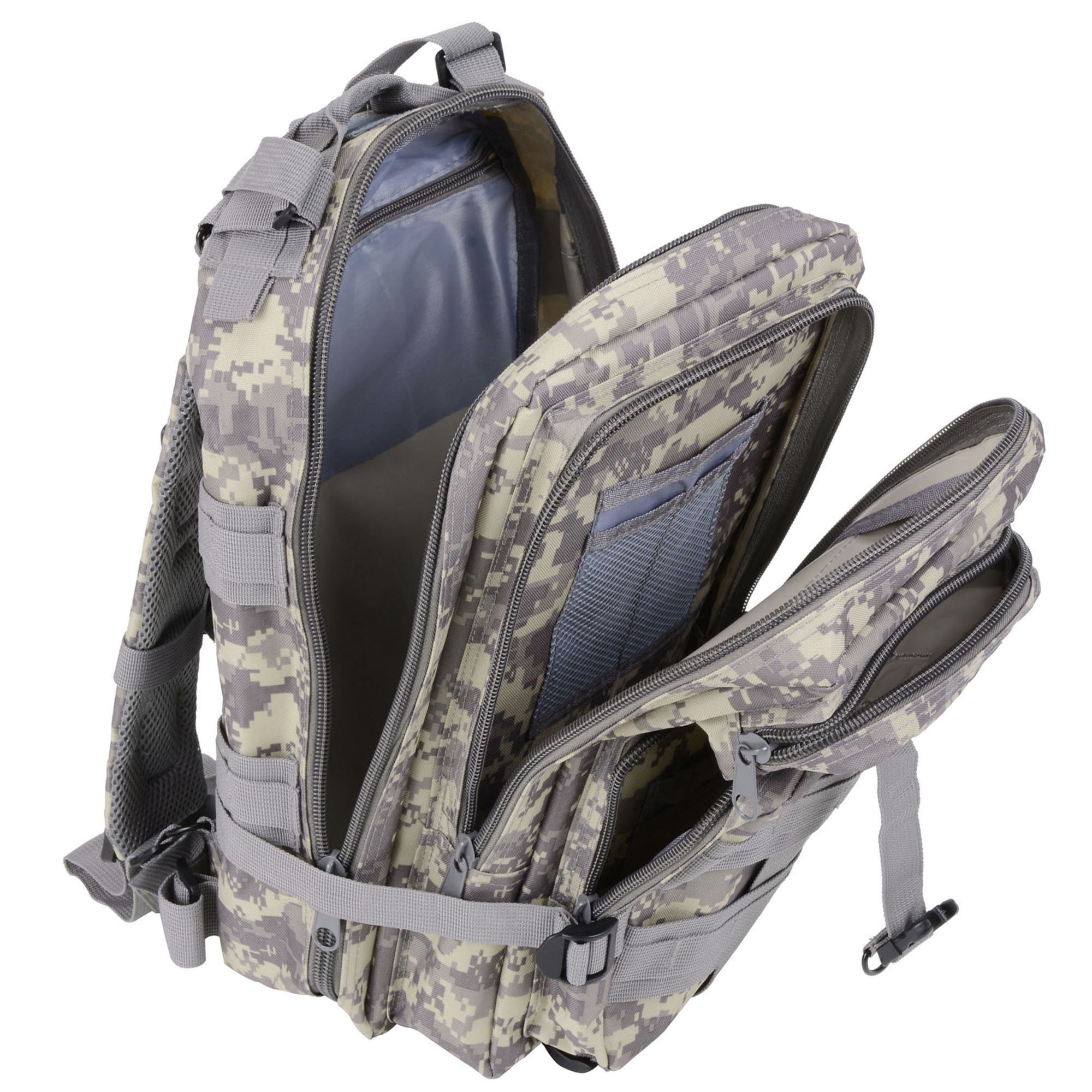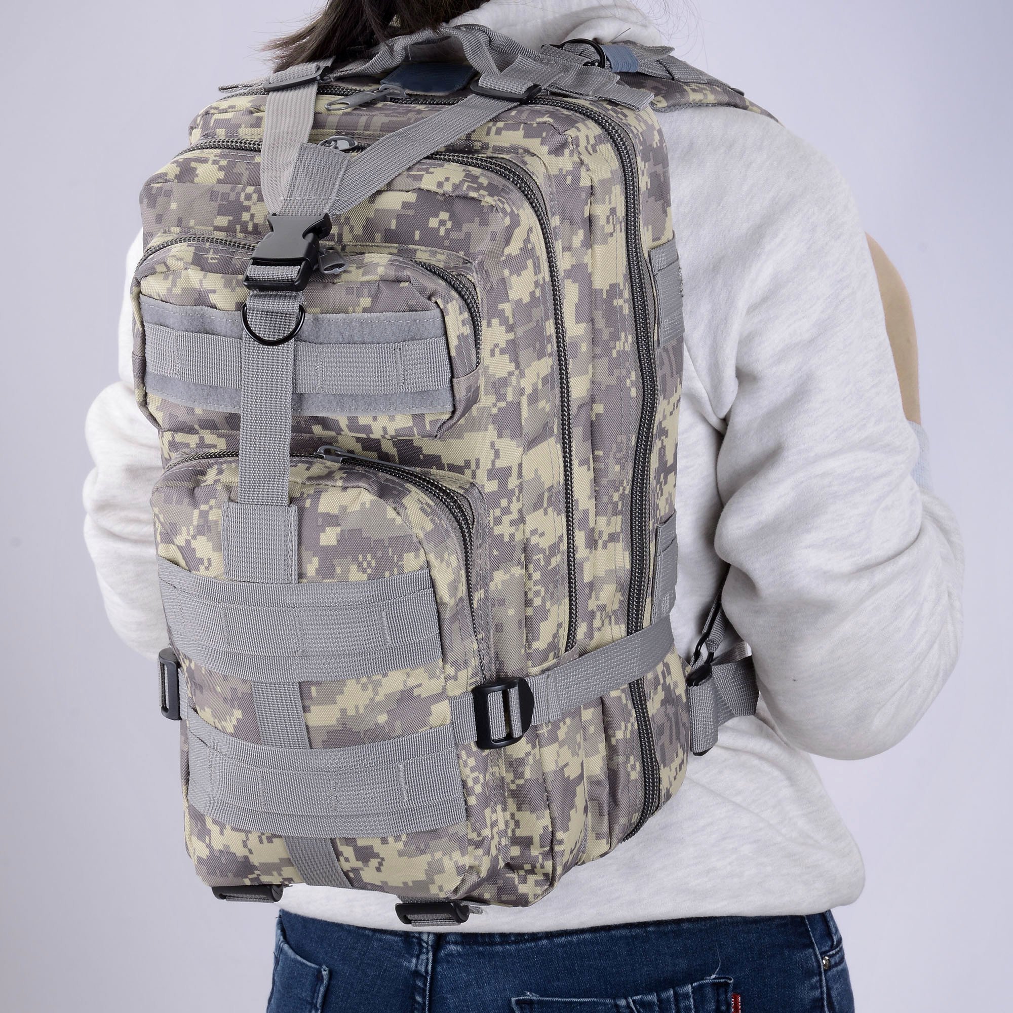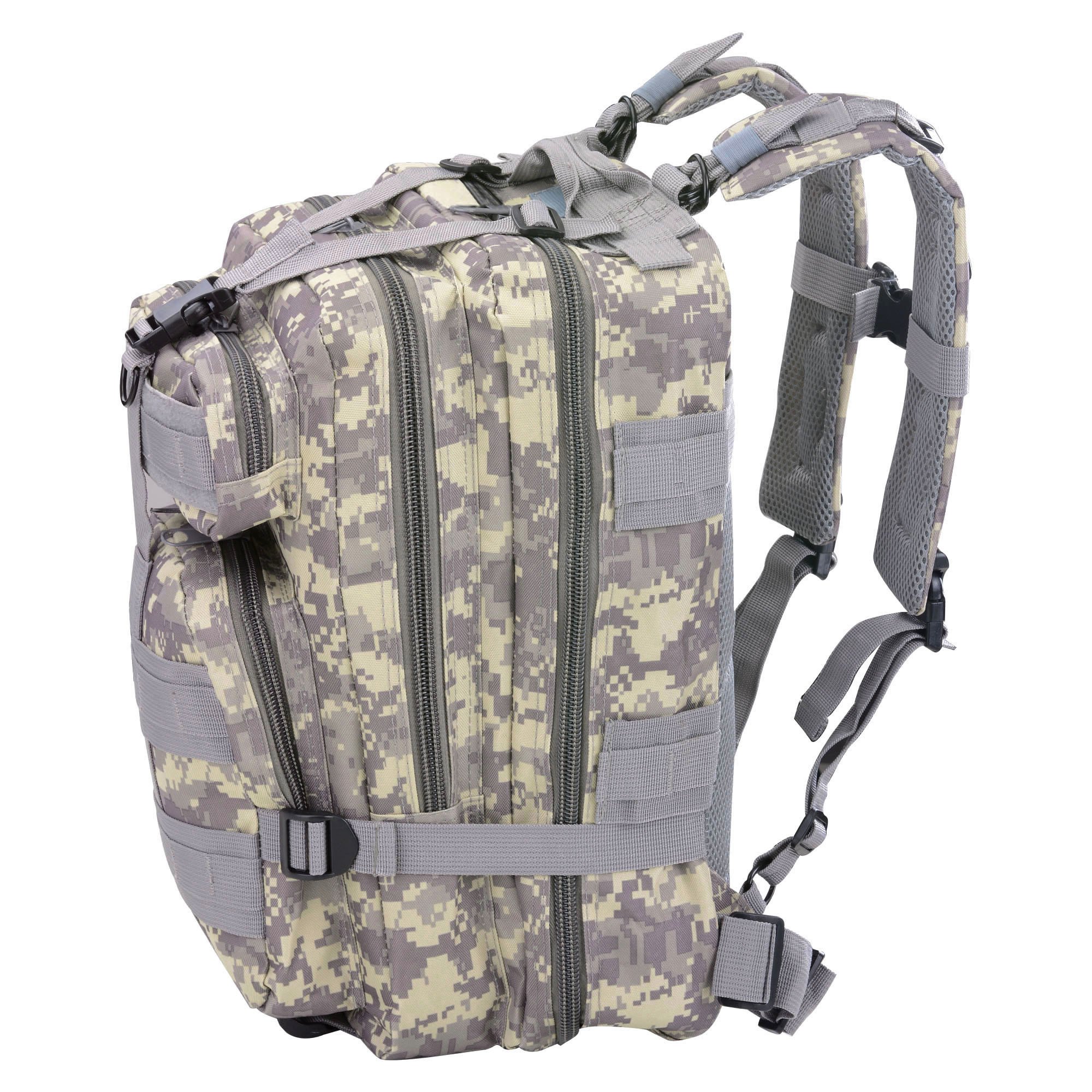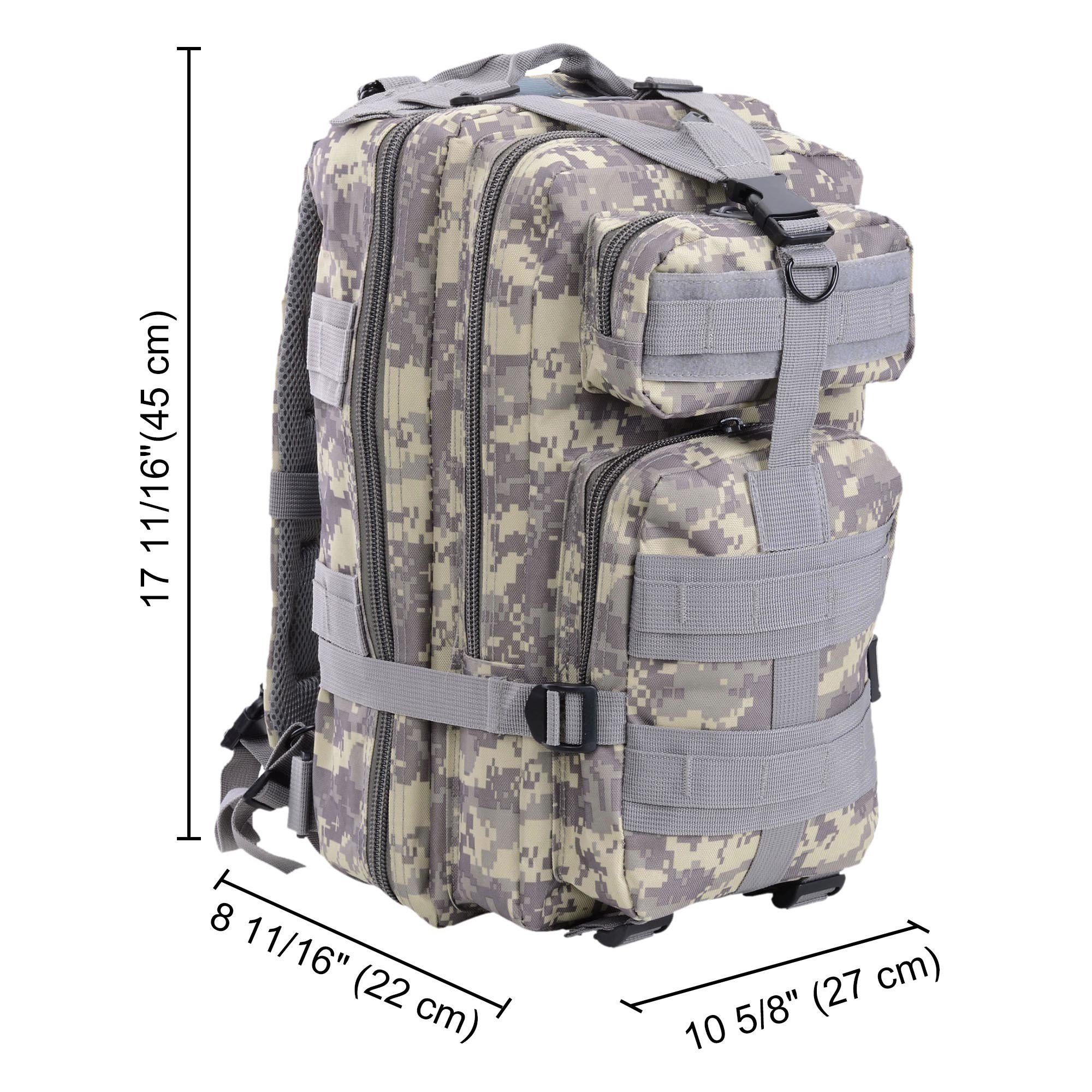 Large Capacity & Multiple Pockets - 17" x 10" x 8" ACU Camouflage Military Molle Tactical Backpack with 28 L large capacity; features 2 zipped large compartments with 2 front pockets & inner pockets; better organize and hold all your outdoor gears in a bag; ideal for mountaineering; hiking; camping; travel; jungle adventure and other sports activities