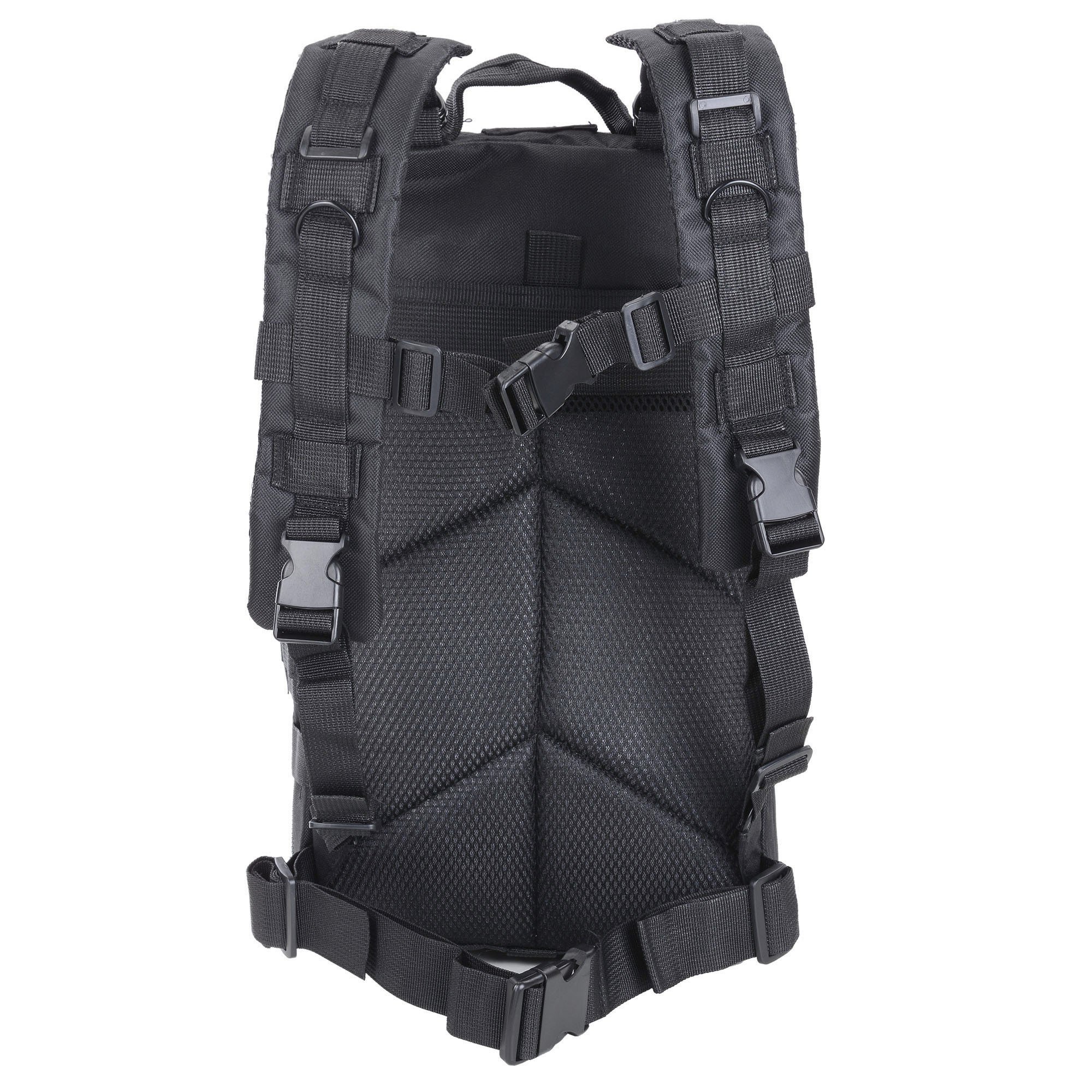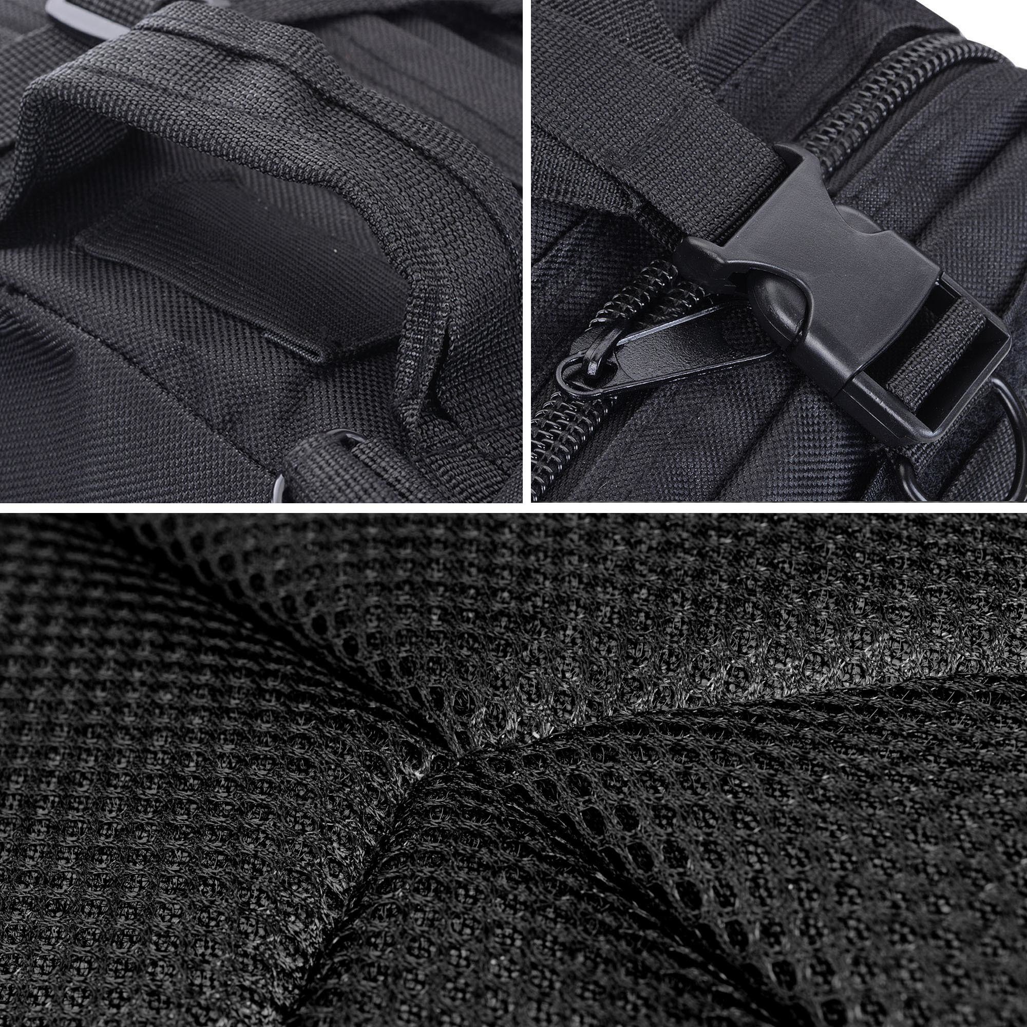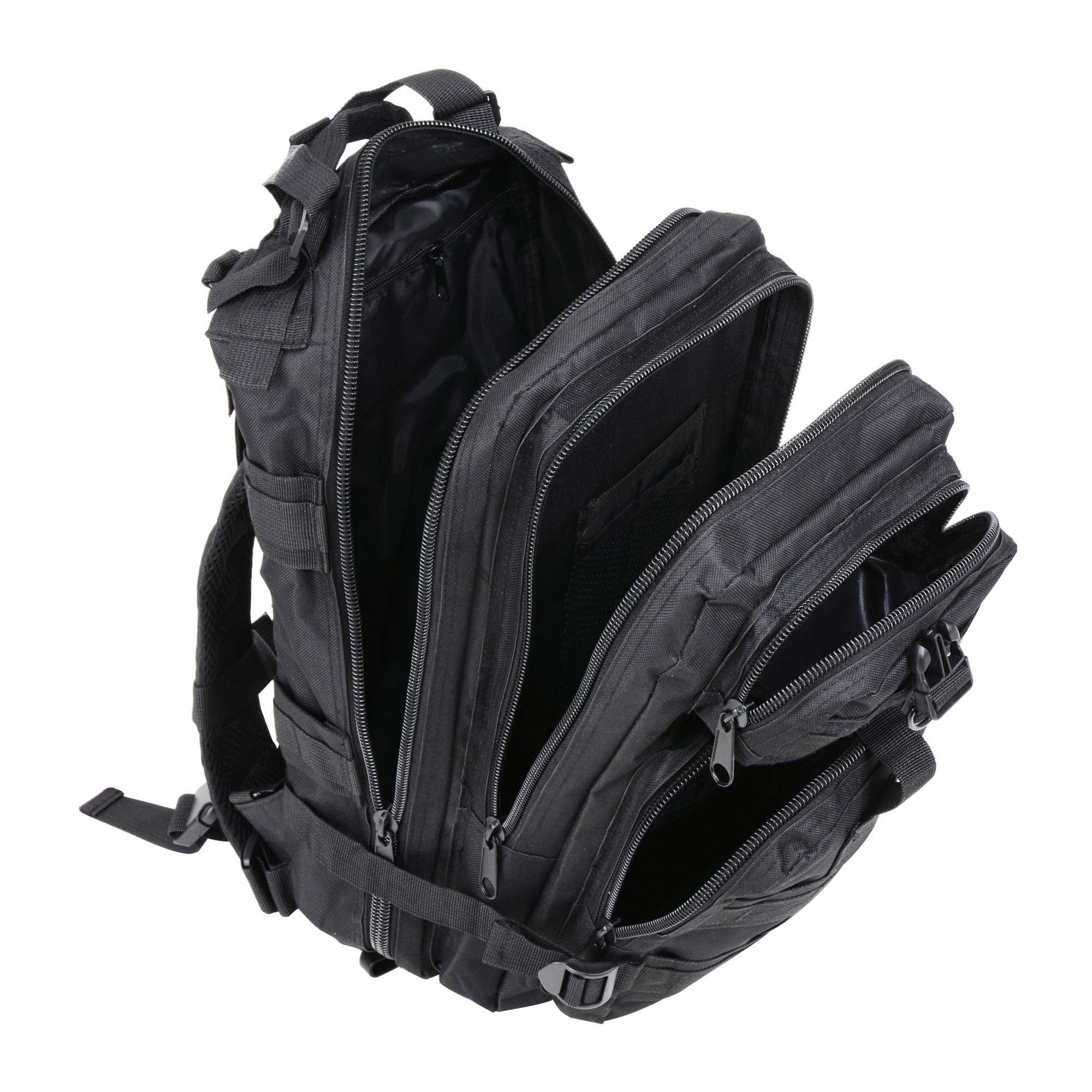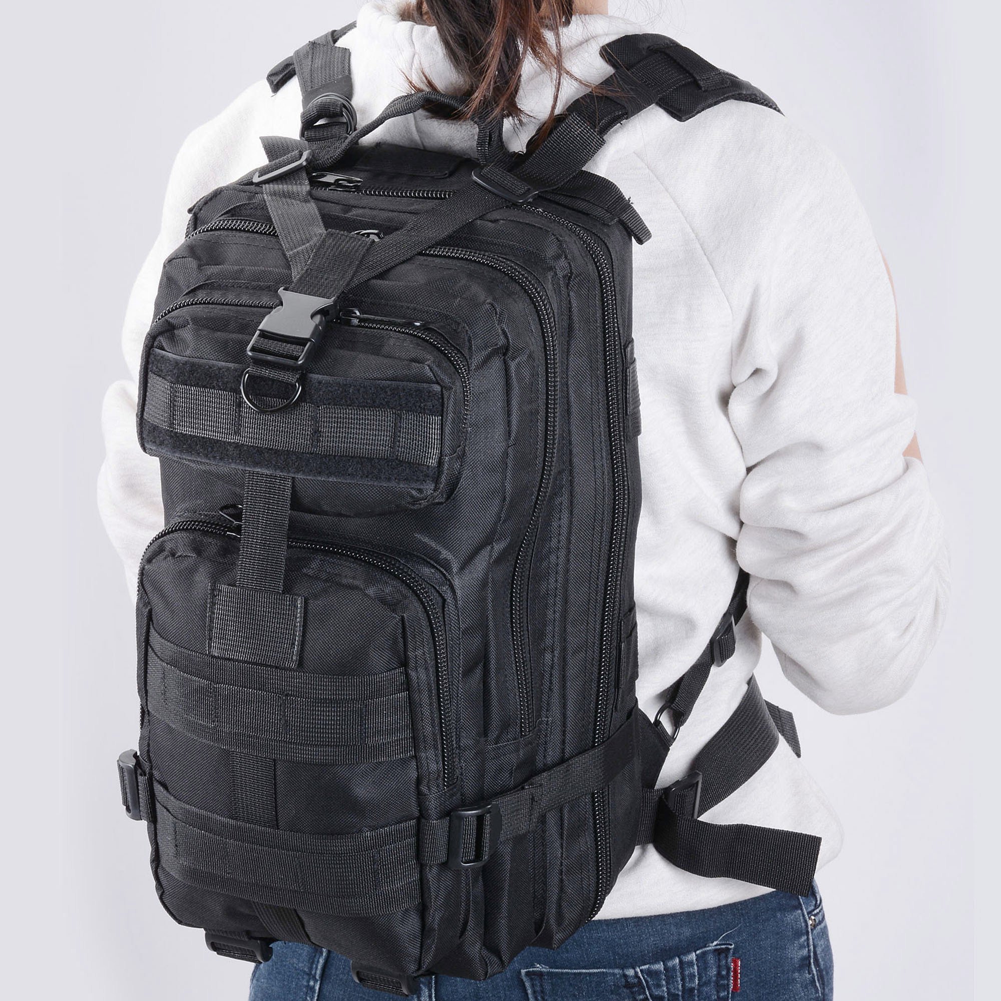 Large Capacity & Multiple Pockets - 17" x 10" x 8" Black Military Molle Tactical Backpack with 28 L large capacity; features 2 zipped large compartments with 2 front pockets & inner pockets; better organize and hold all your outdoor gears in a bag; ideal for mountaineering; hiking; camping; travel; jungle adventure and other sports activities