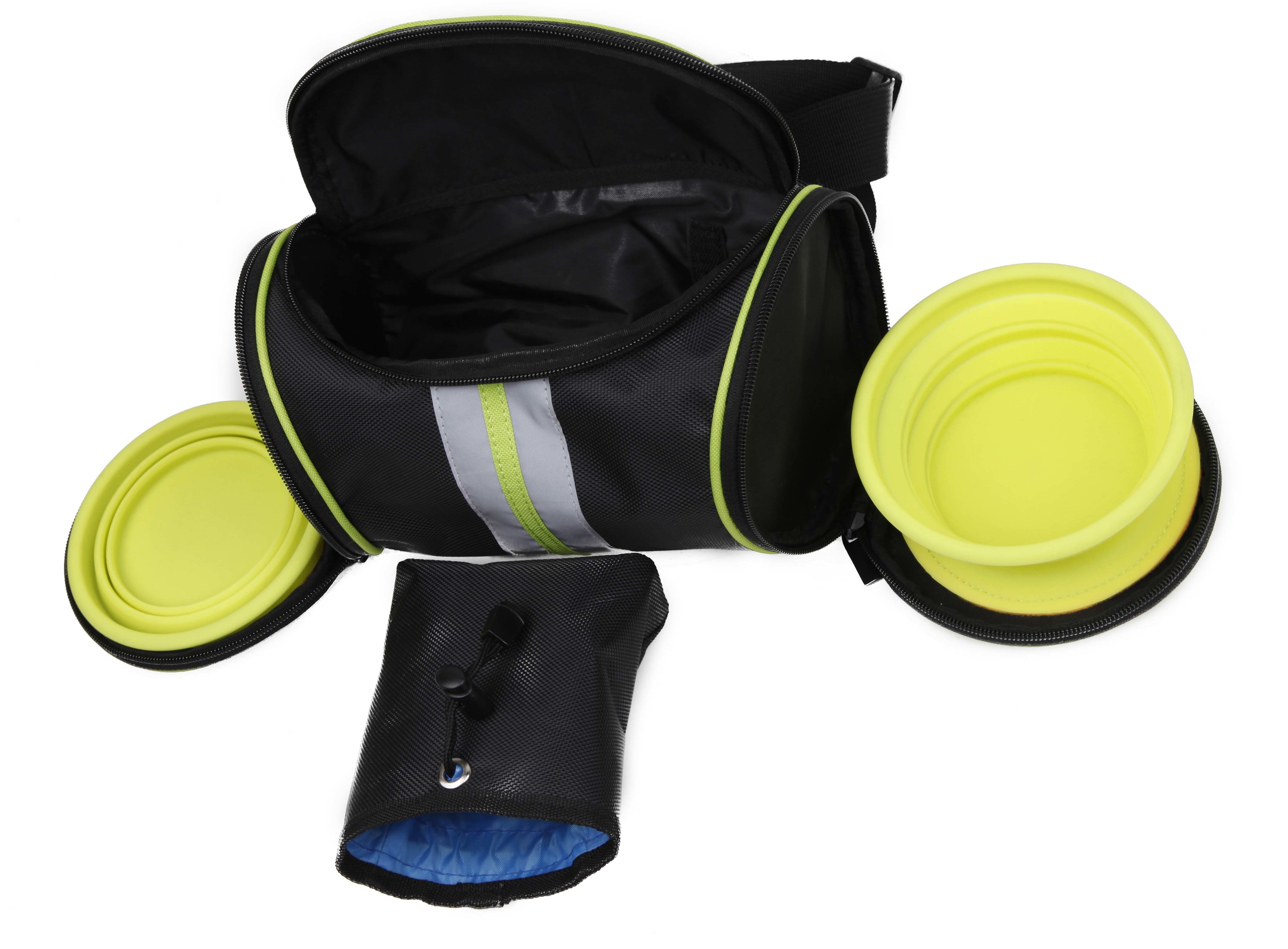 The Ultimate Food and Water Travel Waistband Belt is perfect for Dog Walkers and Pet Travelers. This Dog Belt can be worn across the waist area or over the shoulder. Comes with 2 Rubberized collapsible Dog Bowls in each pocket. This Waistband features a large pouch on the front great for carrying food, water or all other types of Pet Accessories or personal belongings. Additionally this Belt features additional side pouches and features Reflective lining for safe night dog walks. Perfect for hikers or those in need of a Hands Free Dog Walking experience.